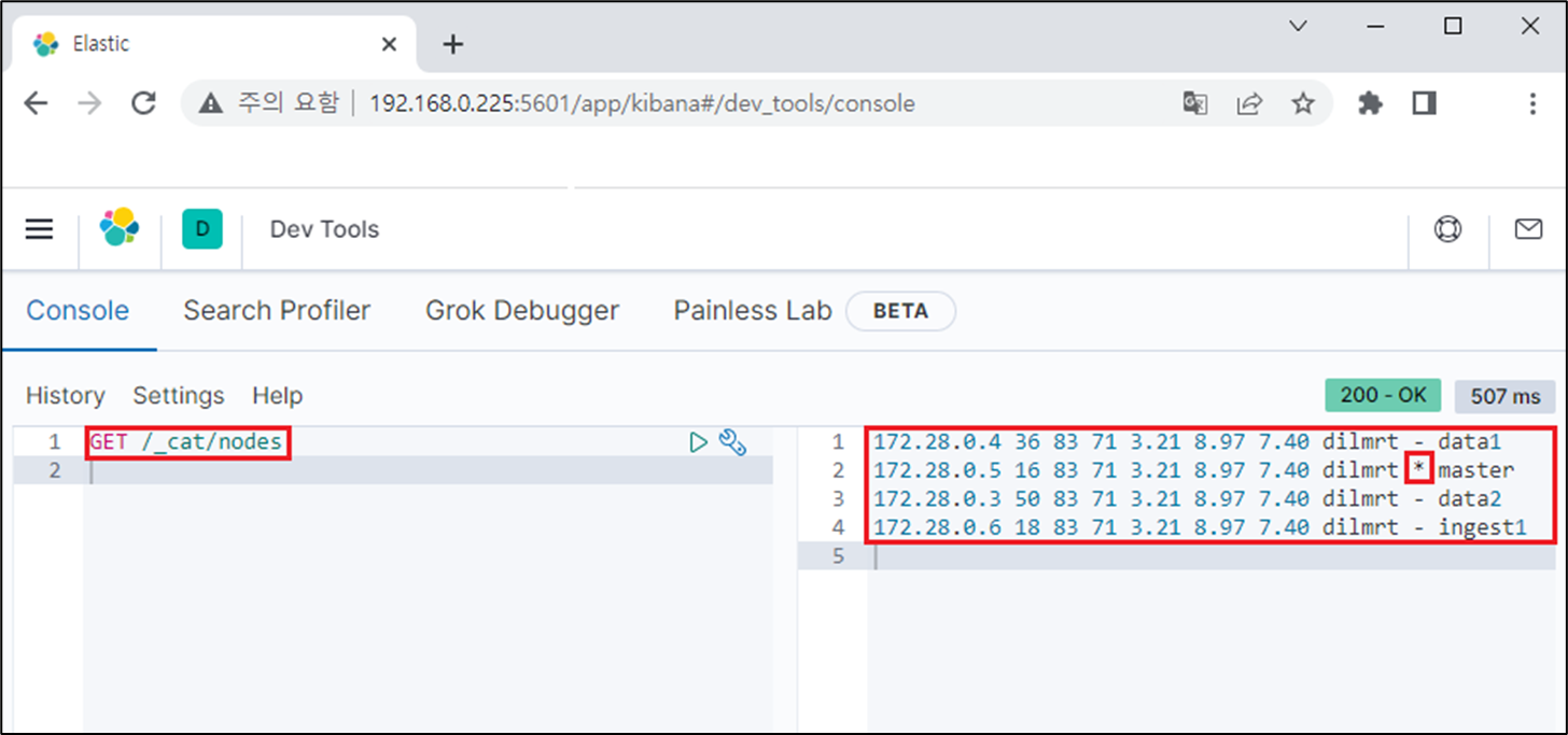 엘라스티서치 클러스터 노드를 확인했을 때 master 노드 앞에 "*" 표시가 되어있으면
