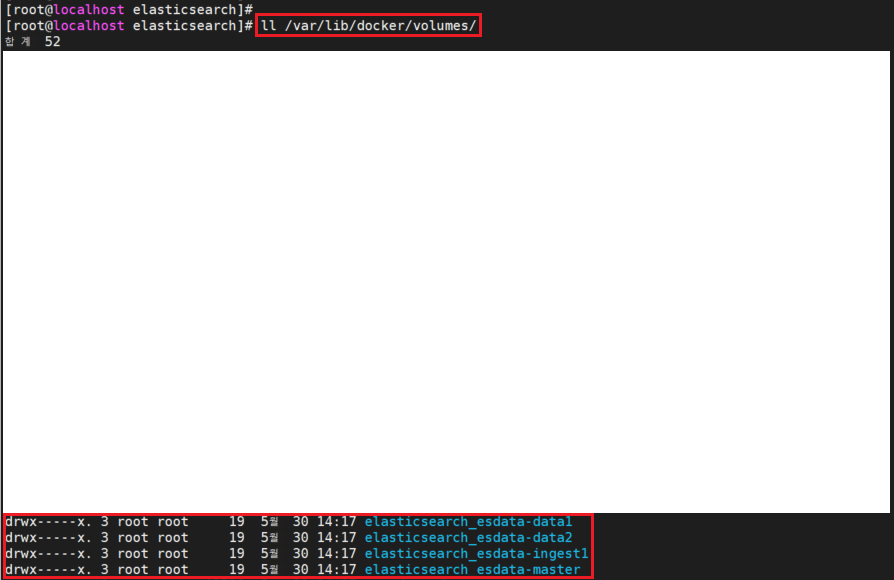 따로 설정을 안하면 esdata-master 디렉토리는 디폴트 경로 /var/lib/docker/volumes/ 밑으로 잡힙니다.