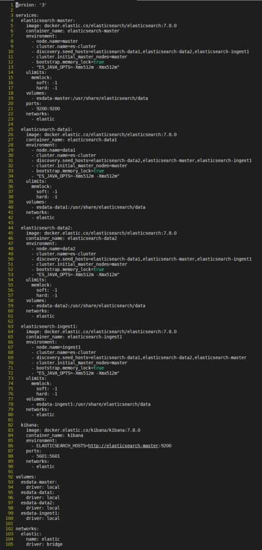 4~80라인: 엘라스틱서치를 master-node, data-node, ingest-node로 컨테이너를 각각 구성하고 있습니다.